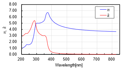 例として図1にシリコン単結晶の紫外線~可視光線領域の複素屈折率の実部 n と虚部 k を示します。図1の横軸は波長(=光速 / 周波数)です。シリコン単結晶は、波長(または周波数)によって nと k の値が変化し、分散特性を持つことが分かります。